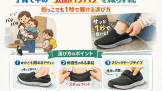 子ども抱っこ・荷物多めでも靴の脱ぎ履きが一瞬になる“手を使わない靴”の選び方。保育園送迎・公園・買い物のリアルに合わせて解説。