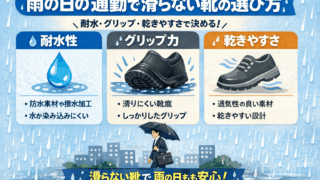 雨の日の通勤で滑らない靴の選び方|耐水・グリップ・乾きやすさで決める