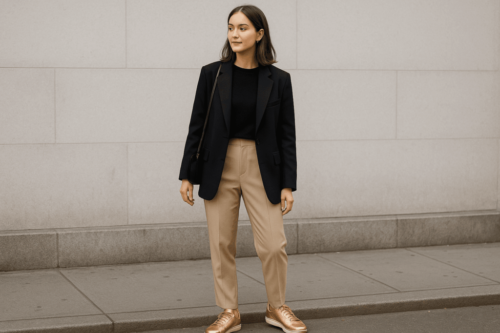 ゴールドは白や黒、グレーといったモノトーンカラーと非常に相性が良いです。例えば、黒スキニー+白シャツにゴールドスニーカーを合わせるだけで、洗練された都会的スタイルが完成。派手すぎず、でも人と差がつく着こなしに。