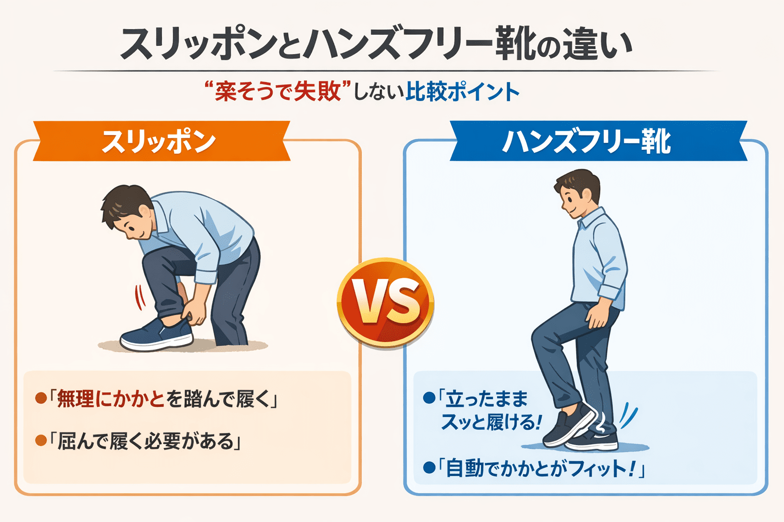 ここではスリッポンとハンズフリー靴の違いを、かかと・フィット・安全性で比較します。
